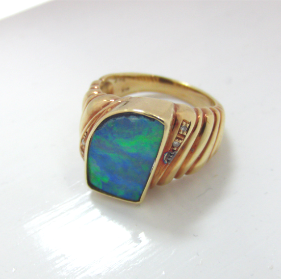 ご愛用されていたボルダーオパールのリングをオリジナルデザインにペンダント加工させていただきました。アンシンメトリーの個性的デザインが素敵なフォルムを演出します。