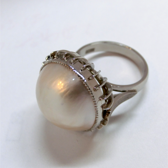 大粒のマベ真珠のリングをペンダントにリフォームさせていただきました。腕を加工してシンプルにバチカンのみを取りつけペンダントに。使い勝手の良いアイテムに変身しました。