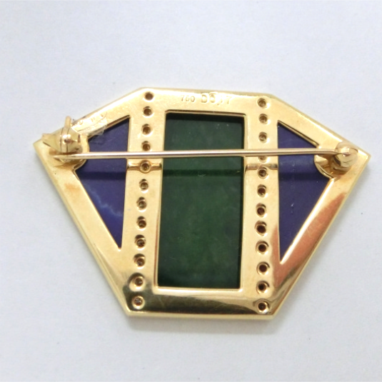 ラピスとヒスイを使ったk18製のブローチ。ペンダントでご使用になりたいというご要望に裏バチカンをつけて完成しました。