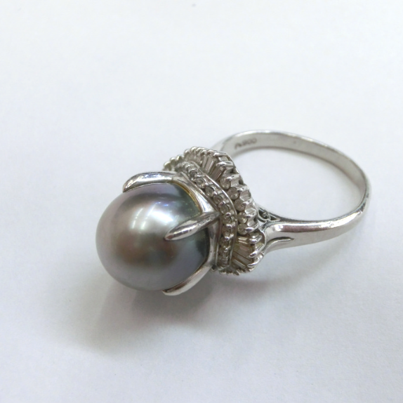 大粒の南洋真珠リングからペンダントへのリフォームをご依頼いただきました。珠の形状の合わせて縦向きに使うことでバランスよくペンダントにおさまり、やさしいグレーカラーの珠とホワイトゴールドのバチカンがとてもよくマッチしています。