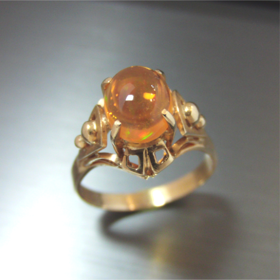 昔のデザイン、オパールのリングを活かしたシンプルでかつ可愛らしいデザインに加工させていただきました。両サイドのルビーは誕生石です。